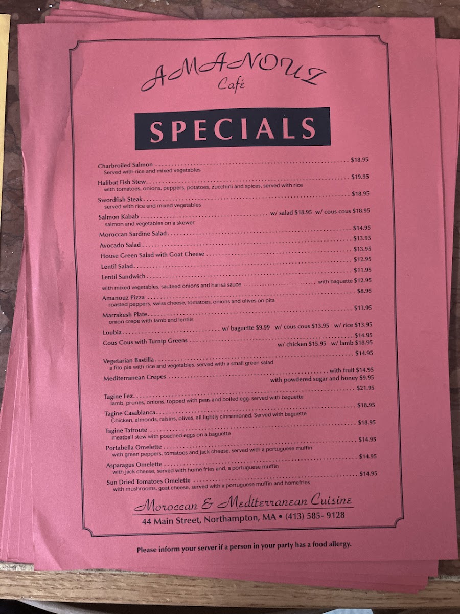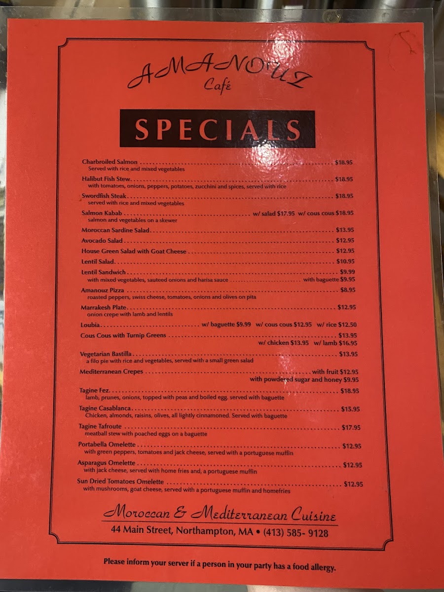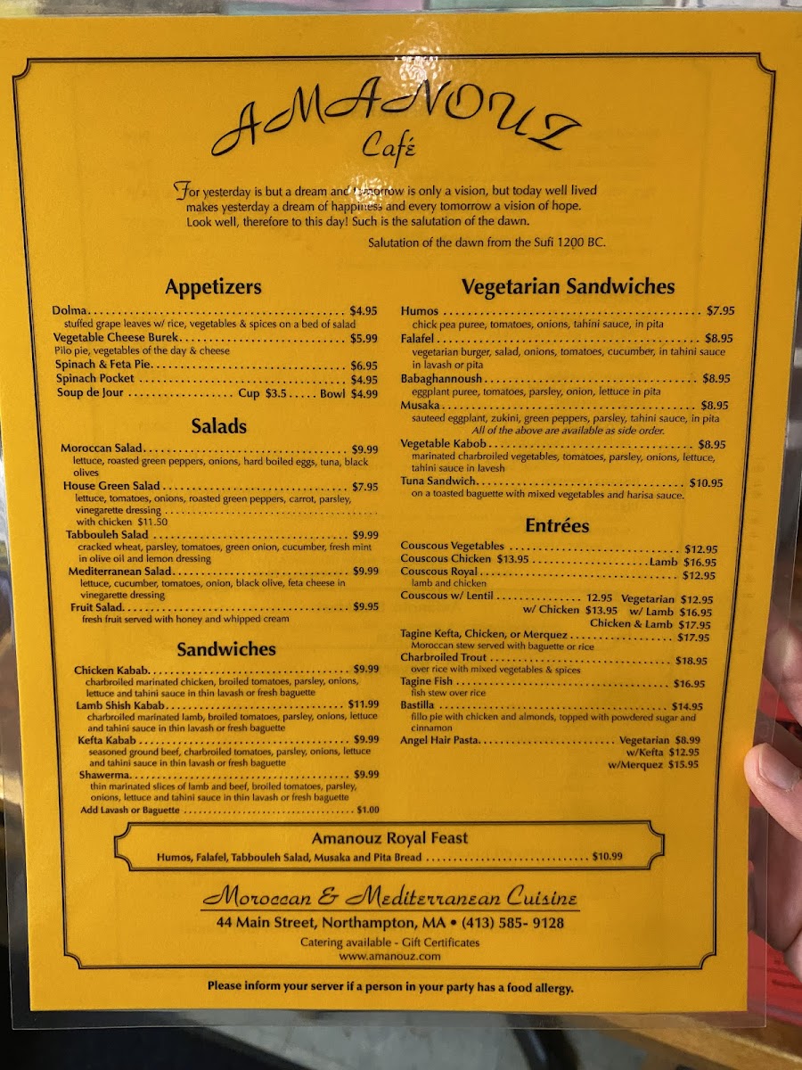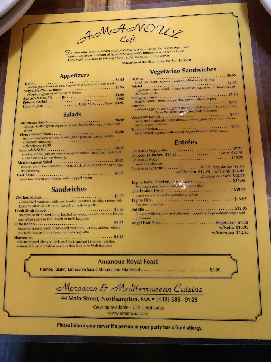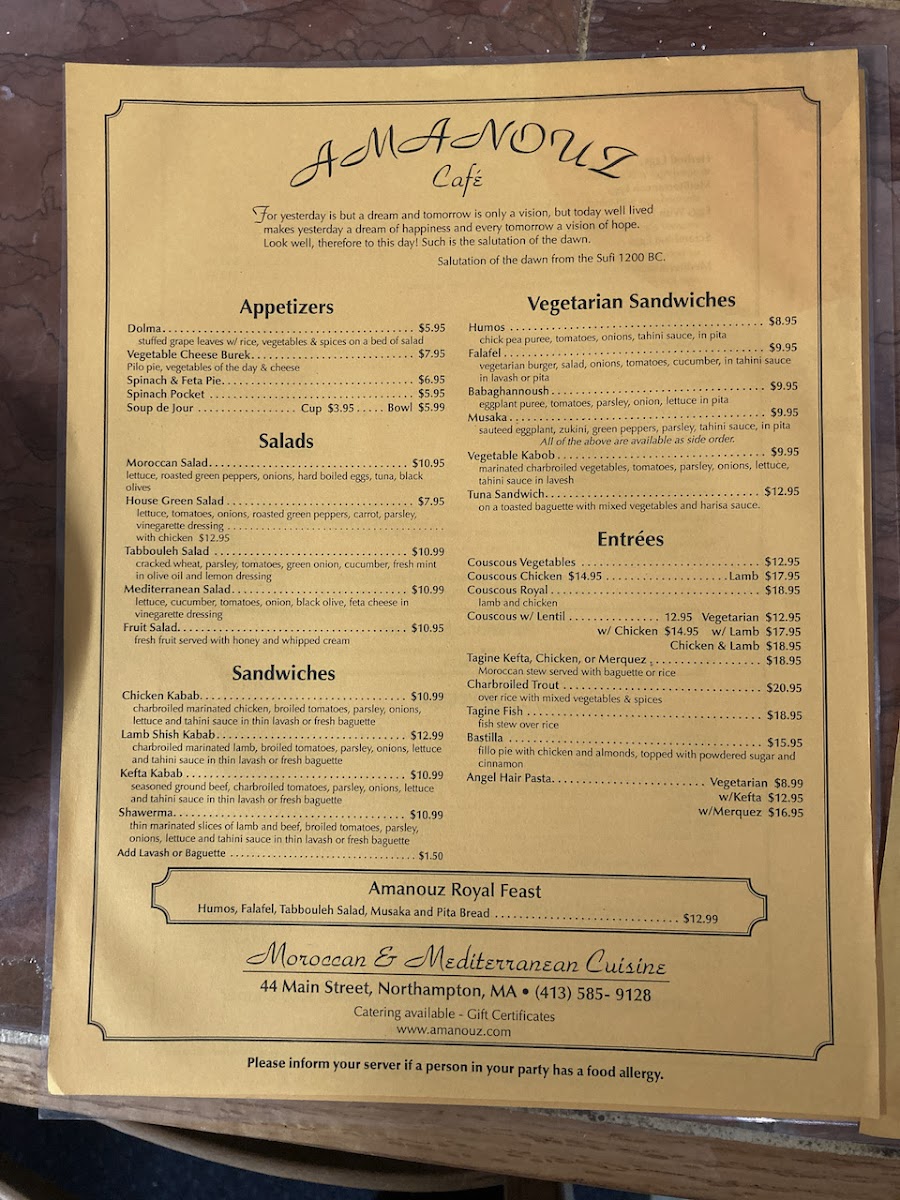 On a sunny day, enjoy a meal al fresco with outdoor seating that enhances the dining experience, allowing you to soak up the vibrant atmosphere of Northampton. With its commitment to using fresh, quality ingredients and a menu packed with delectable flavors, Amanouz Cafe stands out as a local gem that you won’t want to miss. Whether you’re a local or just passing through, make it a point to savor the magic of Mediterranean cuisine at Amanouz Cafe — it’s a culinary journey worth taking!
